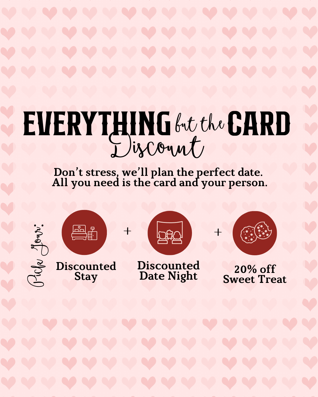 It's Discounts on Discounts this February! Enjoy 10% off your February Stay + A Discounted Date Night + 20% off Tiff's Treats cookie delivery! It's a perfect Valentine's Date